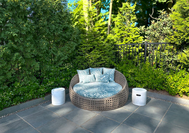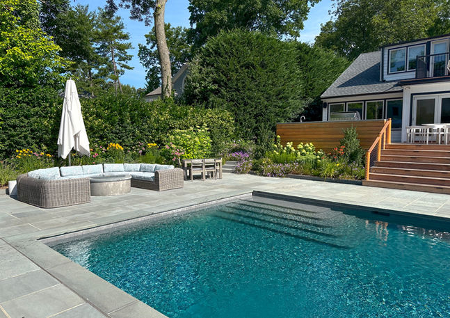 The landscape design for this Mamaroneck property, located just a few blocks from Long Island Sound, provides the household with an assortment of outdoor amenities and useable spaces. Beresford Landscape Design created the landscape plan and planting design, and installed the masonry and plantings on site.