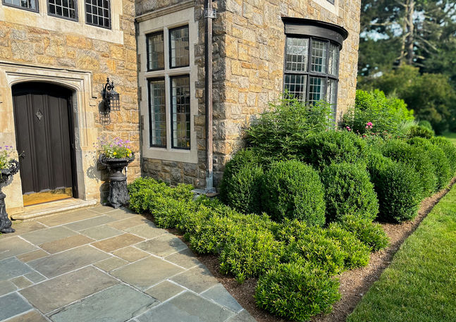 The landscape design of this Pelham Manor property by Beresford Landscape aligns with the owners' extensive renovation of their 1926 home. The restrained planting design compliments the classic stone work of the home’s traditional architecture, while still providing opportunities for color and seasonal interest. Boxwood, and other evergreen shrubs are laid out as architectural elements used to frame other plantings. A more varied planting palette is used along the property’s perimeter. These garden spaces offer a greater mix of colors and textures, and provide more benefit to local bees, butterflies, and other pollinators. Shadier areas on the property tend to forgo lawn in favor of stepping stone paths that cut through garden spaces. Shade tolerant perennials including Ferns, Solomon’s Seal, and Hosta transform these paths beneath mature trees into lush woodland trails.