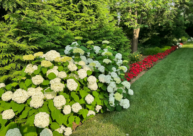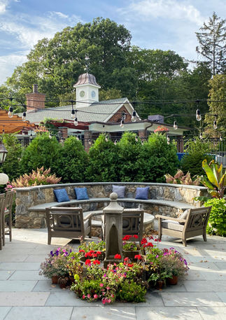 The design includes a pool and terrace, complete with a spa, pool house, and several areas for lounge and sunbathing. A garden path leads from the pool to the bar and dining area. Sculptures, water features, and plantings in vibrant colors surround a patio sized large enough to act as a dance floor, but modestly enough to facilitate the intimacy of family gatherings. A wooden pergola frames an outdoor kitchen space that features a bluestone countertop with barstools, a grill, pizza oven, refrigeration, and storage. The bar and dining area also features a curved stone bench surrounding a custom-built firepit, and picnic tables flanked with moveable potted planters to provide additional seating space. The landscape design includes a secondary outdoor bar and dining space as well to accommodate the property’s guest house. Between these dining areas is a “Great Lawn” enclosed by evergreen screening and garden plantings, perfect for lawn games and picnics. Beresford Landscape Design continues to maintain the landscape at the property and installs seasonal planters.